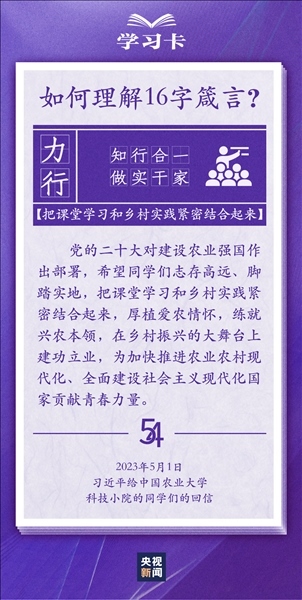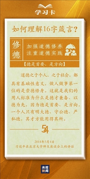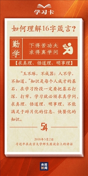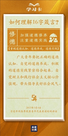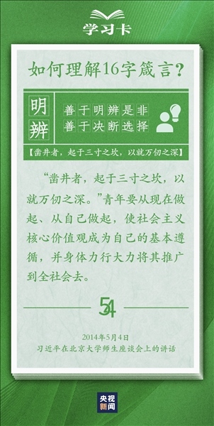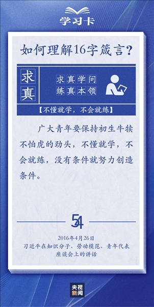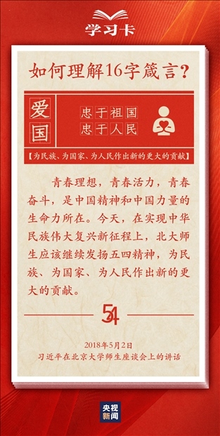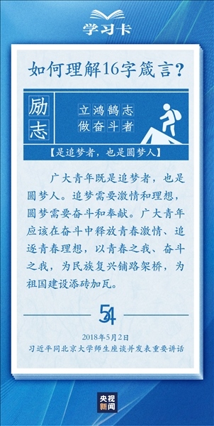 青春,是人生最美的時(shí)光。青年,是國家的未來和民族的希望。每每與青年對(duì)話,習(xí)近平總書記無不囑托青年“立大志”“堅(jiān)定理想信念”“擔(dān)當(dāng)復(fù)興大任”,言之諄諄,意之殷殷。對(duì)于新時(shí)代青年如何走好人生路,習(xí)近平總書記2018年提出十六字箴言,字短意長(zhǎng)。今天,一起學(xué)習(xí)↓