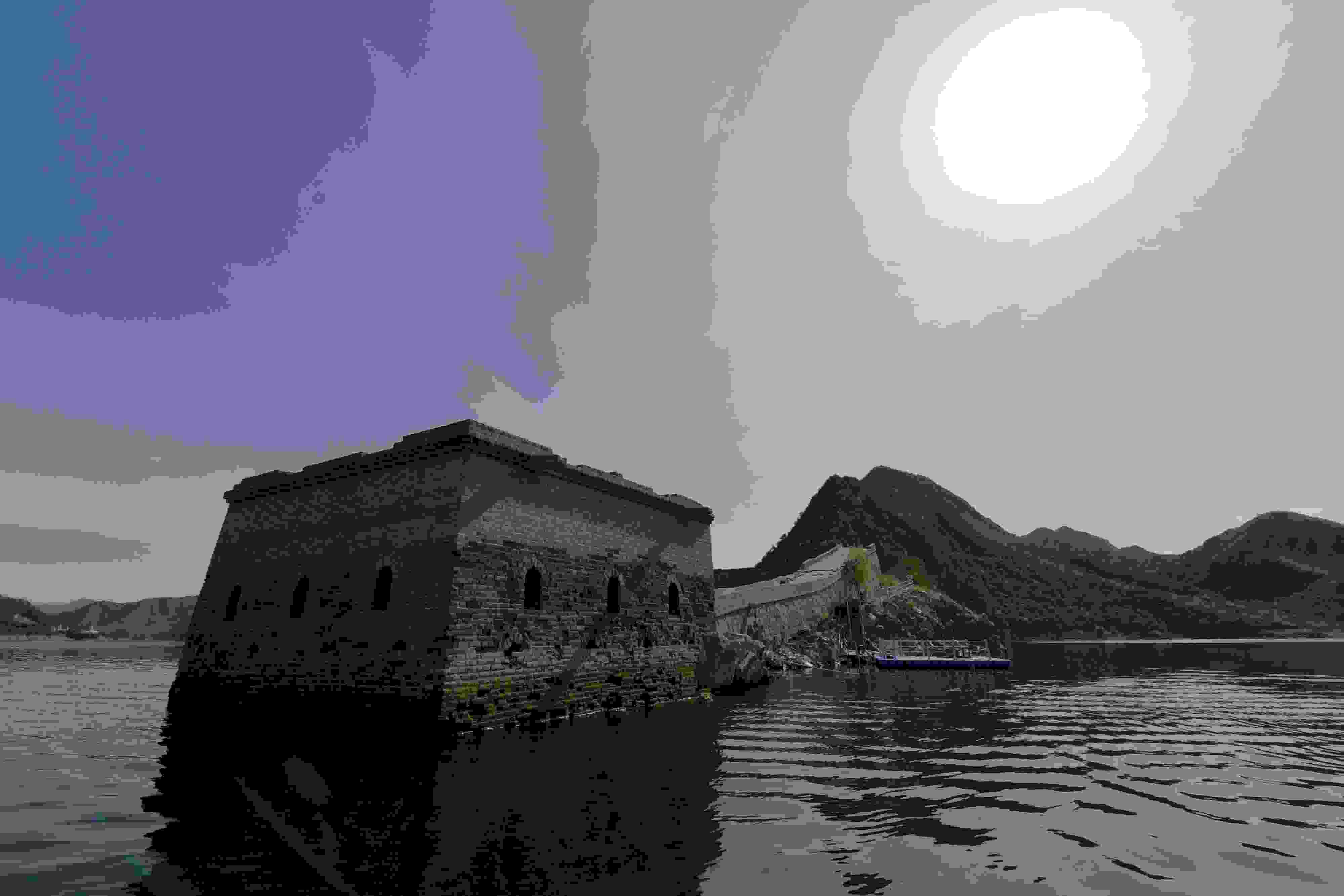 2023年5月8日,河北承德,寬城滿族自治縣境內(nèi)潘家口水庫(kù)的“水下長(zhǎng)城”。這段“水下長(zhǎng)城”是明長(zhǎng)城的遺址,20世紀(jì)70年代因建設(shè)水利樞紐工程,部分長(zhǎng)城隱沒水下,從而形成“水下長(zhǎng)城”景觀。 視覺中國(guó)