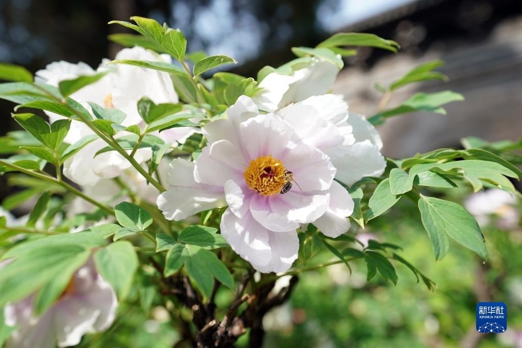5月8日,在太原雙塔寺景區(qū),蜜蜂在花間采蜜。