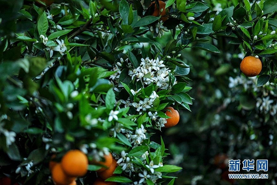柑橘園里,濃郁的花香隨風(fēng)四溢,金燦燦的柑橘掩映在枝葉中,星星點點的小白花點綴其間,花香和果香交織沁人心脾。新華網(wǎng)發(fā)(余鴻 攝)