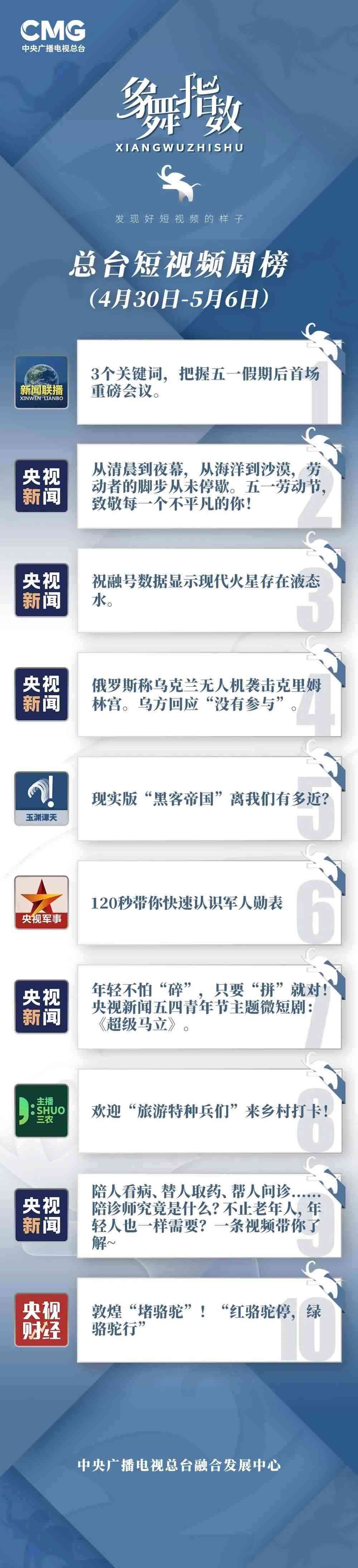 中央廣播電視總臺(tái)“象舞指數(shù)”評(píng)議品牌,推出主流媒體短視頻周榜、總臺(tái)短視頻周榜。在2023年4月30日—5月6日,這些內(nèi)容引發(fā)大眾關(guān)注: