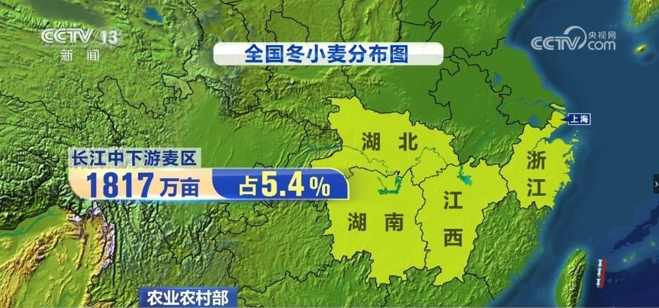 長江中下游麥區(qū)包括上海、浙江、江西、湖北、湖南,冬小麥面積1817萬畝,占5.4%。