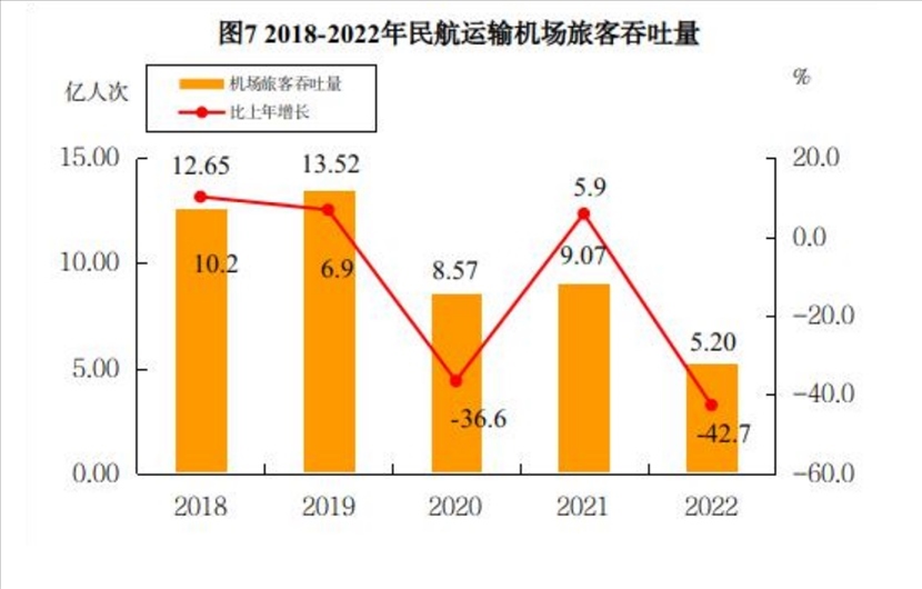 2018年至2022年民航運(yùn)輸機(jī)場(chǎng)旅客吞吐量。來(lái)源于2022年民航行業(yè)發(fā)展統(tǒng)計(jì)公報(bào)