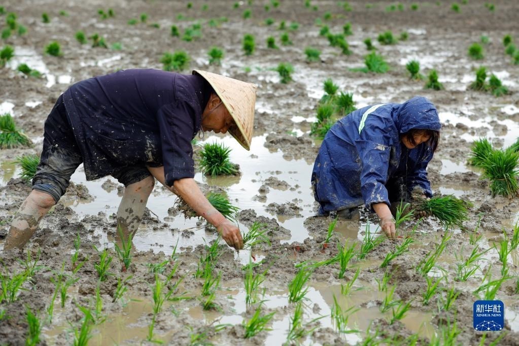 5月9日,在四川省崇州市道明鎮(zhèn)協(xié)和社區(qū),農(nóng)民在一片高標準農(nóng)田里種植水稻。