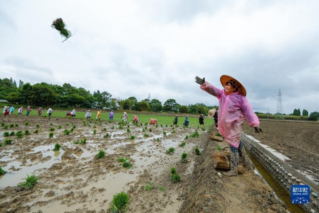5月9日,在四川省崇州市道明鎮(zhèn)協(xié)和社區(qū),農(nóng)民向一片高標準農(nóng)田里拋水稻秧苗,以方便其他農(nóng)民插秧。