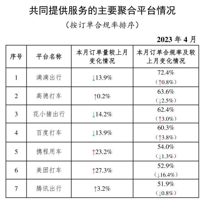其中,面向乘客、與網(wǎng)約車(chē)平臺(tái)公司共同提供服務(wù)的平臺(tái)(俗稱(chēng)“聚合平臺(tái)”)完成1.96億單,環(huán)比下降0.7%。按訂單合規(guī)率由高到低的分別是滴滴出行、高德打車(chē)、花小豬出行、百度打車(chē)、攜程用車(chē)、美團(tuán)打車(chē)、騰訊出行。