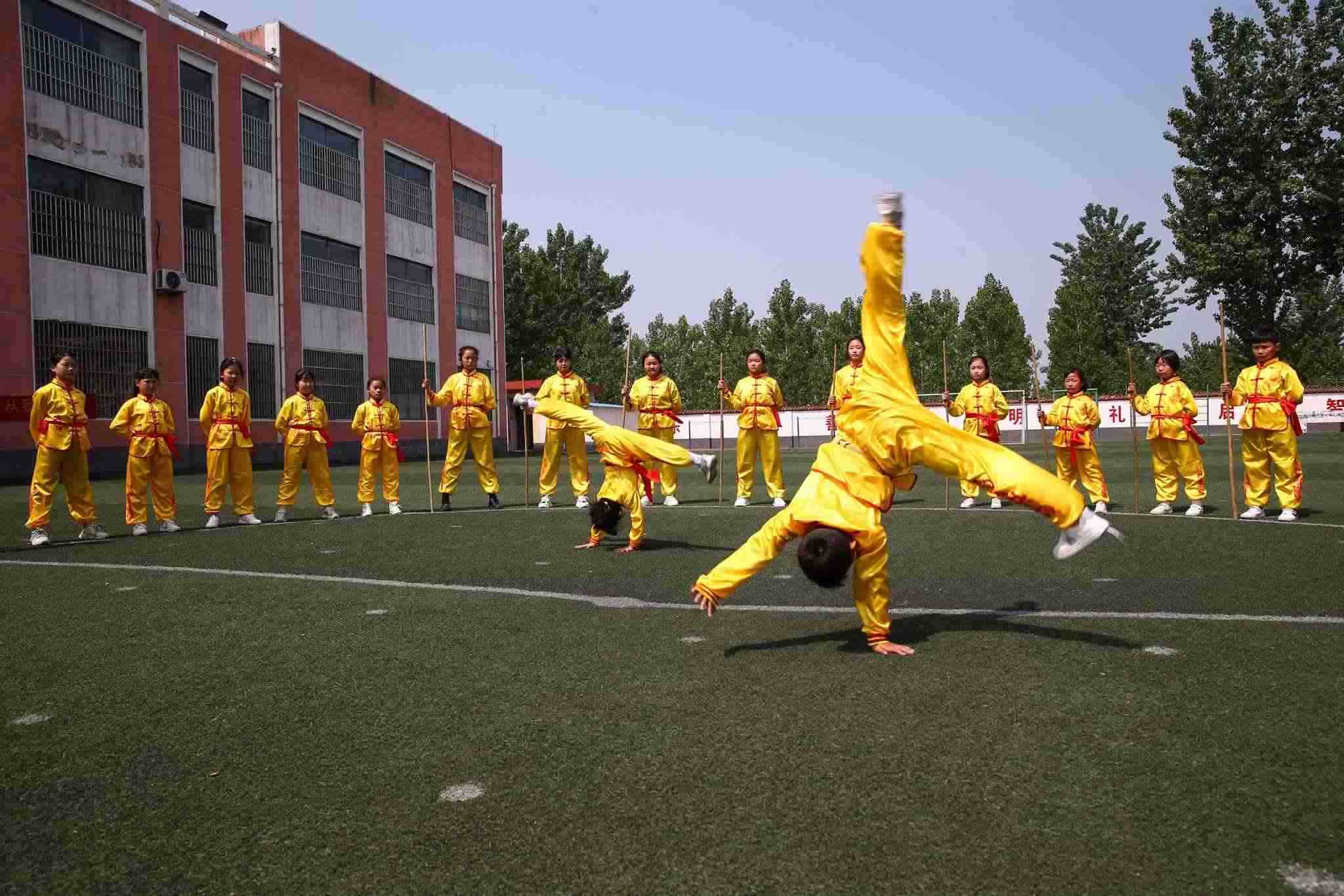 近年來(lái),臨沂市蘭陵縣韓塘小學(xué)將傳統(tǒng)武術(shù)引進(jìn)校園,選擇武術(shù)操作為“陽(yáng)光大課間”特色項(xiàng)目,組建社團(tuán)進(jìn)行武術(shù)訓(xùn)練,在豐富學(xué)生課余生活、提高身體素質(zhì)的同時(shí),傳承傳統(tǒng)武術(shù)文化。視覺(jué)中國(guó)