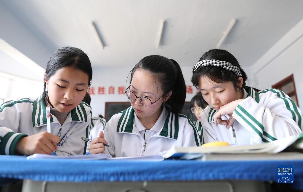 女兒李昕偉(中)課間和同學(xué)們交流習(xí)題,由于聽不太清,她需要目不轉(zhuǎn)睛地盯著同學(xué)的筆(5月8日攝)。