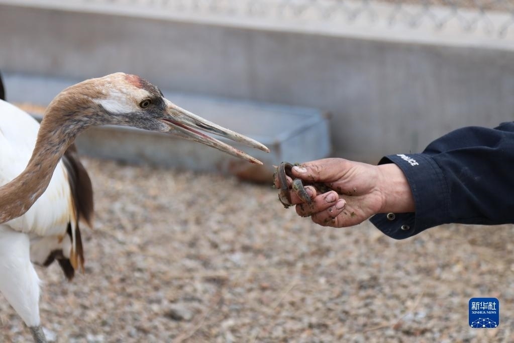 5月11日,徐沃德樂(lè)胡給救助的丹頂鶴喂食。