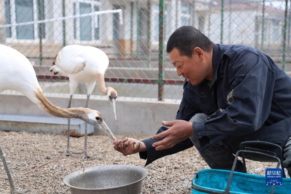 5月11日,徐沃德樂(lè)胡在觀察救助的丹頂鶴進(jìn)食。