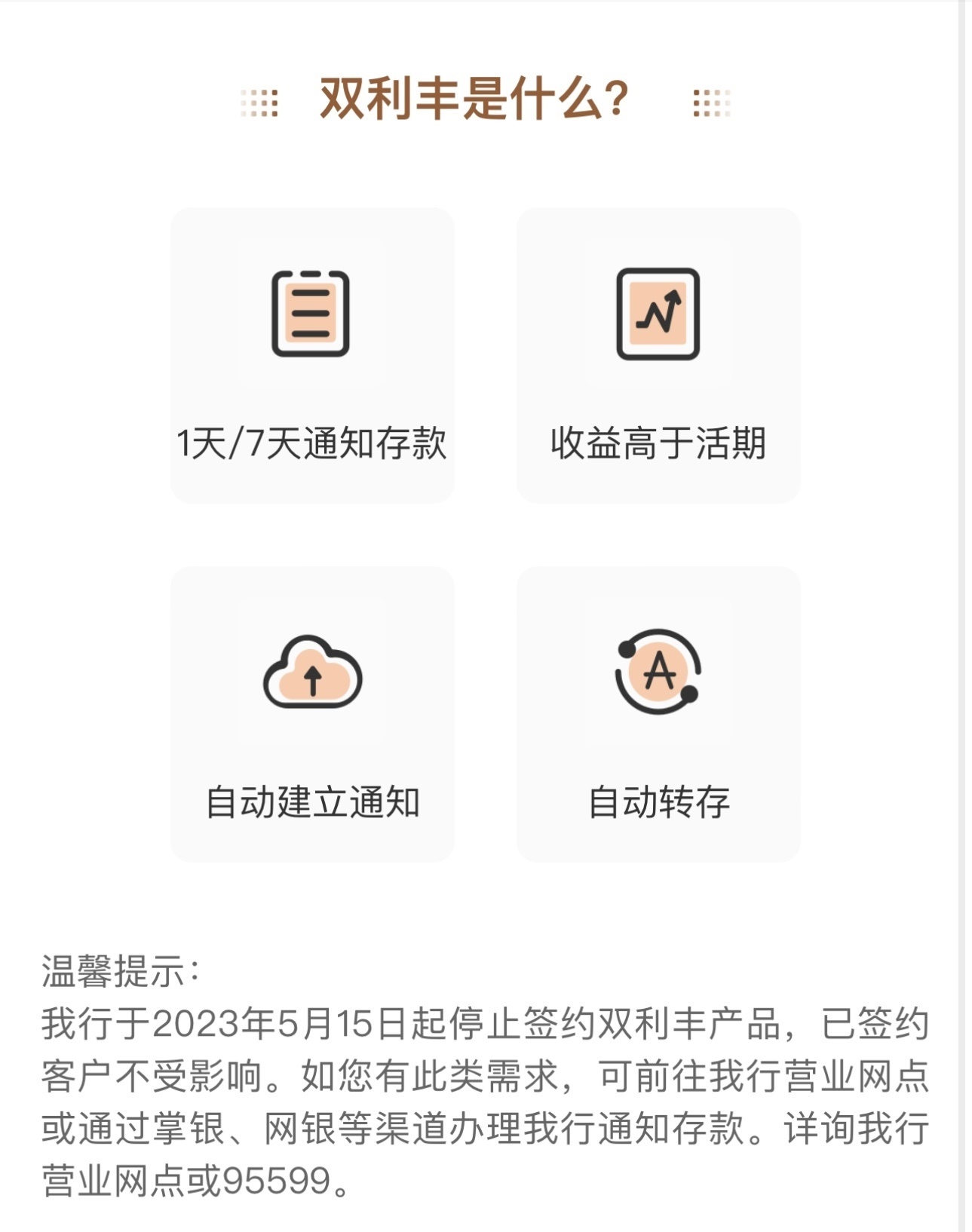 農(nóng)業(yè)銀行App顯示,該行存款專區(qū)中的智能通知存款產(chǎn)品“雙利豐”于5月15日起停止簽約,已簽約客戶不受影響。農(nóng)行表示,如有此類需求,可前往營(yíng)業(yè)網(wǎng)點(diǎn)或通過掌銀、網(wǎng)銀等渠道辦理通知存款。