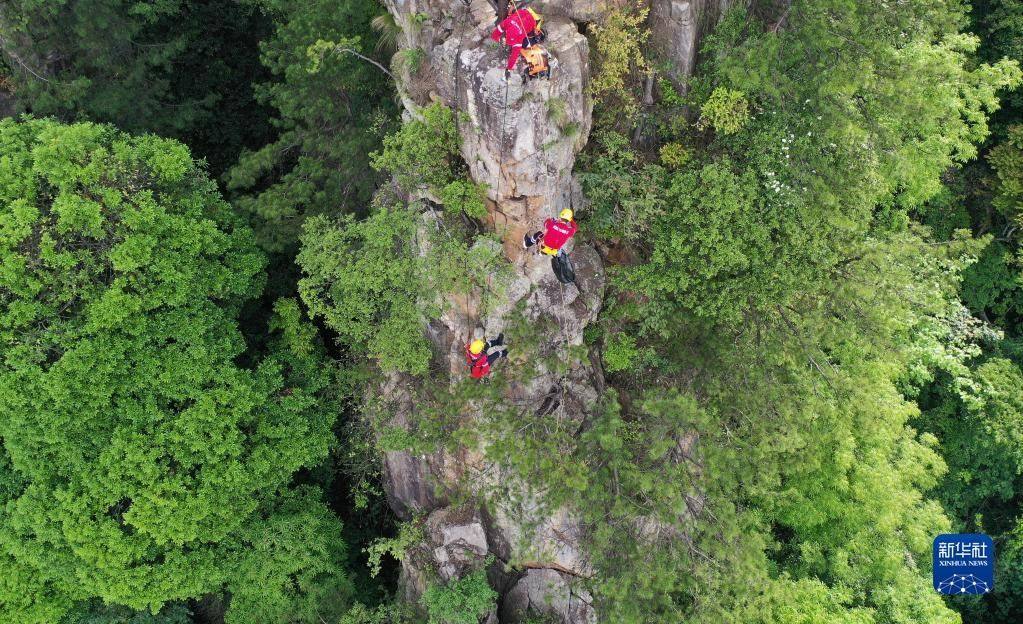 5月14日,張家界市武陵源區(qū)山地應(yīng)急救援隊(duì)隊(duì)員在天子山的絕壁間索降。