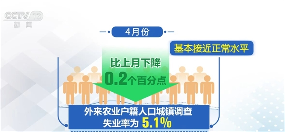 全國(guó)城鎮(zhèn)調(diào)查失業(yè)率連續(xù)兩個(gè)月下降。4月份,全國(guó)城鎮(zhèn)調(diào)查失業(yè)率為5.2%,比上月下降0.1個(gè)百分點(diǎn),接近2019年疫情前的統(tǒng)計(jì)水平。