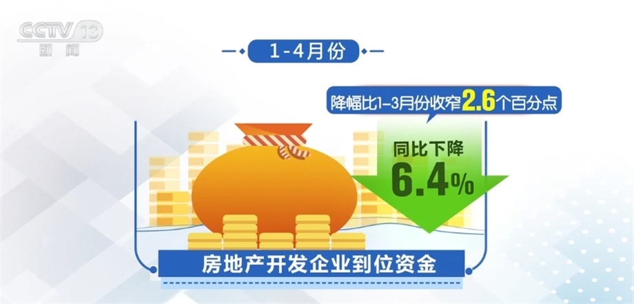 從房企資金看,受到市場(chǎng)銷(xiāo)售改善影響,房地產(chǎn)開(kāi)發(fā)企業(yè)資金緊張狀況有所緩解,1—4月份,房地產(chǎn)開(kāi)發(fā)企業(yè)到位資金同比下降6.4%,降幅比1—3月份收窄2.6個(gè)百分點(diǎn)。