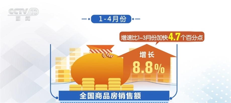從銷(xiāo)售看,隨著政策效應(yīng)逐步顯現(xiàn),以及前期疫情積累的需求釋放,1—4月份,全國(guó)商品房銷(xiāo)售面積同比下降0.4%,降幅比1—3月份收窄1.4個(gè)百分點(diǎn)。銷(xiāo)售額增長(zhǎng)8.8%,增速比1—3月份加快4.7個(gè)百分點(diǎn)。