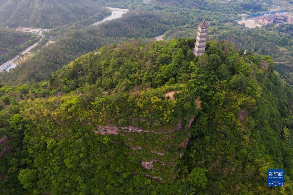俯瞰天臺(tái)縣的赤城山及山頂?shù)牧哄?月16日攝,無人機(jī)照片)。