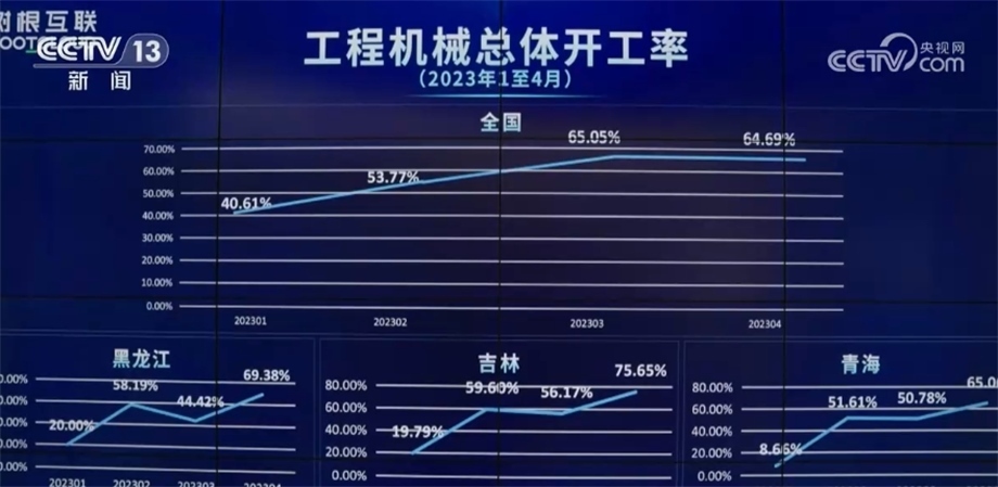 這個(gè)大屏幕反映的是全國(guó)挖掘機(jī)的開(kāi)工情況,相關(guān)負(fù)責(zé)人告訴記者,“挖掘機(jī)指數(shù)”顯示出今年我國(guó)工程機(jī)械行業(yè)開(kāi)始出現(xiàn)回暖跡象。4月份,全國(guó)工程機(jī)械總體開(kāi)工率為64.69%,環(huán)比3月基本持平。12個(gè)?。▍^(qū)、市)創(chuàng)下今年以來(lái)最好成績(jī)。