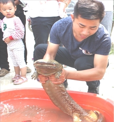 戴莊村民將野生娃娃魚送至野生動物保護(hù)站。受訪者供圖