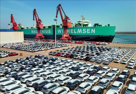 一艘滾裝船在江蘇連云港港東方港務(wù)分公司碼頭裝運(yùn)出口汽車(2023年5月16日攝) 王健民攝 / 本刊