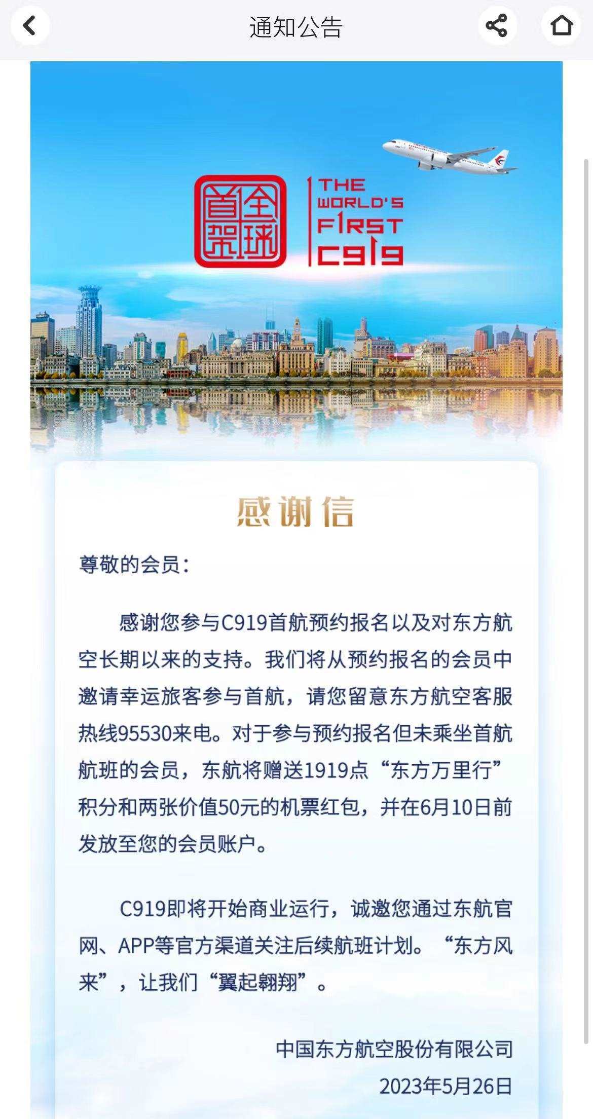 東航APP上還發(fā)布了一則感謝信,信中表示,C919即將開始商業(yè)運(yùn)行,東航將從預(yù)約報(bào)名的會(huì)員中邀請(qǐng)幸運(yùn)旅客參與首航,對(duì)于參與預(yù)約報(bào)名但未乘坐首航航班的會(huì)員,東航將贈(zèng)送1919點(diǎn)“東方萬(wàn)里行”積分和兩張價(jià)值50元的機(jī)票紅包,并在6月10日前發(fā)放至?xí)T賬戶。