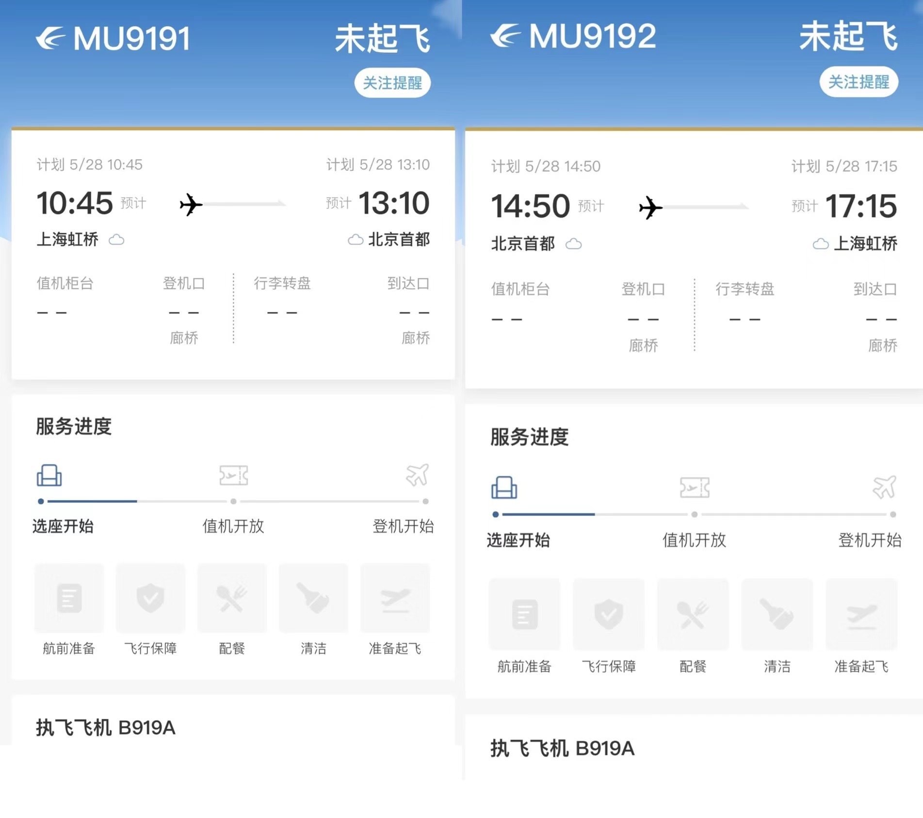 此外,5月26日稍早些,澎湃新聞?dòng)浾咴跂|航APP上查詢發(fā)現(xiàn),東航C919首個(gè)商業(yè)航班飛行計(jì)劃公布,班次為5月28日MU9191上海虹橋-北京首都,MU9192北京首都-上海虹橋,計(jì)劃飛行時(shí)長(zhǎng)2小時(shí)25分鐘。