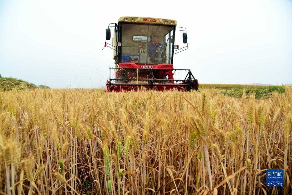 5月27日,在山東省棗莊市光明路街道田莊村麥田里,農(nóng)民駕駛農(nóng)機(jī)收獲小麥。