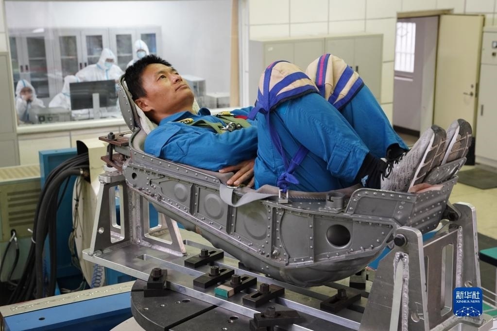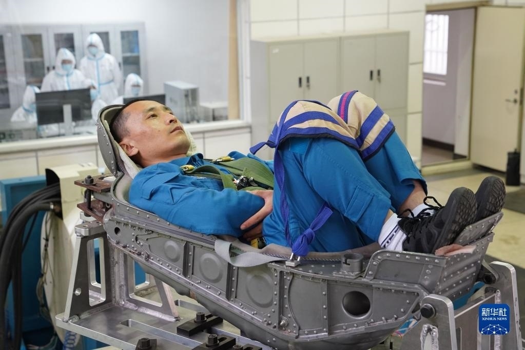 神舟十六號航天員朱楊柱在進(jìn)行振動體驗(2022年4月27日攝)。新華社發(fā)(王夏陽 攝)