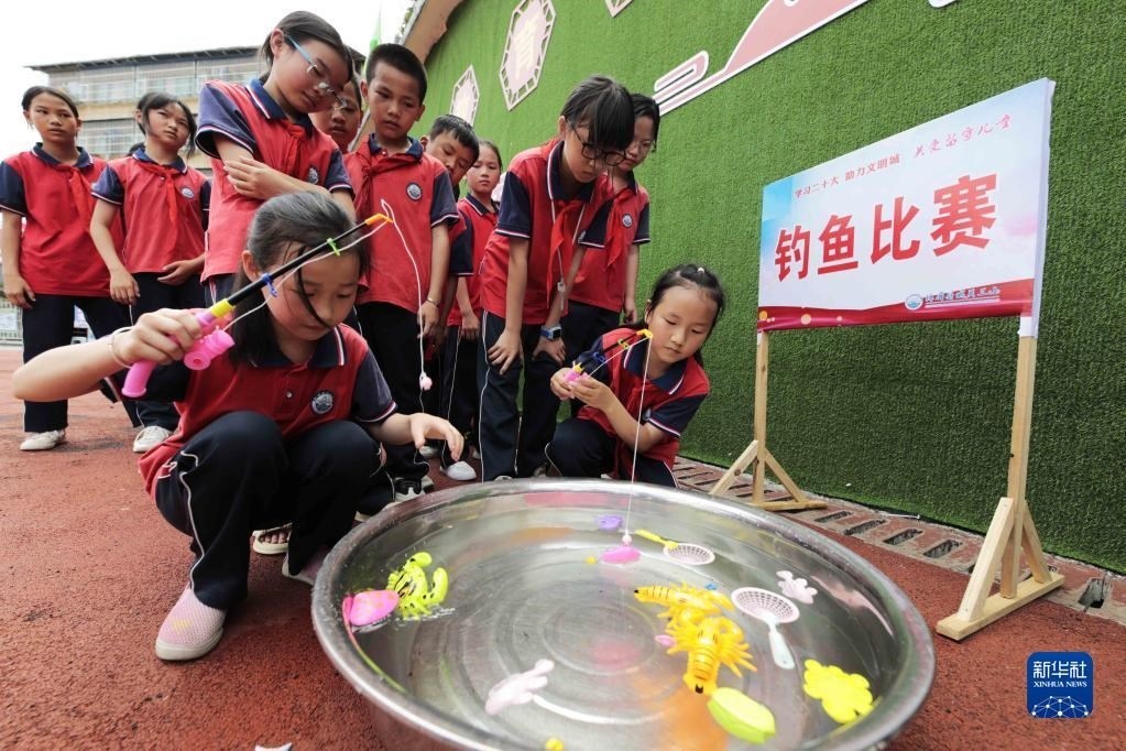 5月30日,貴州省錦屏縣城關第三小學學生在參加釣魚比賽。 新華社發(fā)(楊曉海攝)