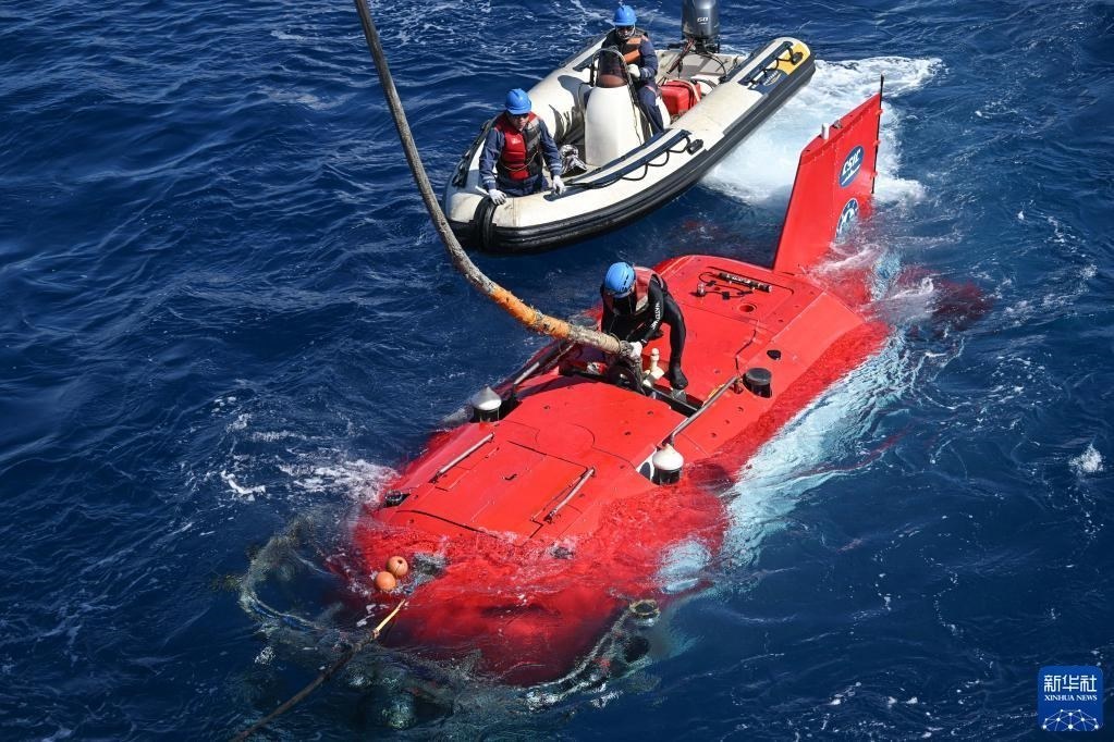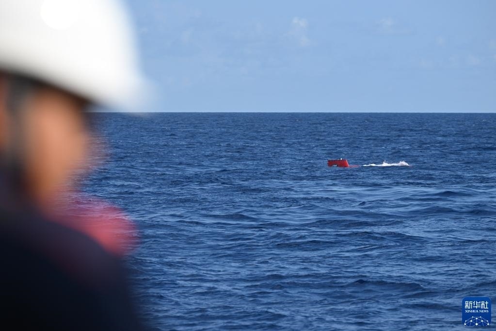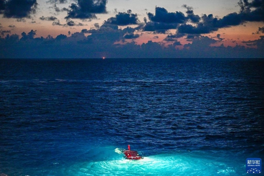 在結(jié)束當(dāng)日的水下調(diào)查后,搭載著考古隊員的“深海勇士”號載人潛水器浮出海面(5月27日攝)。