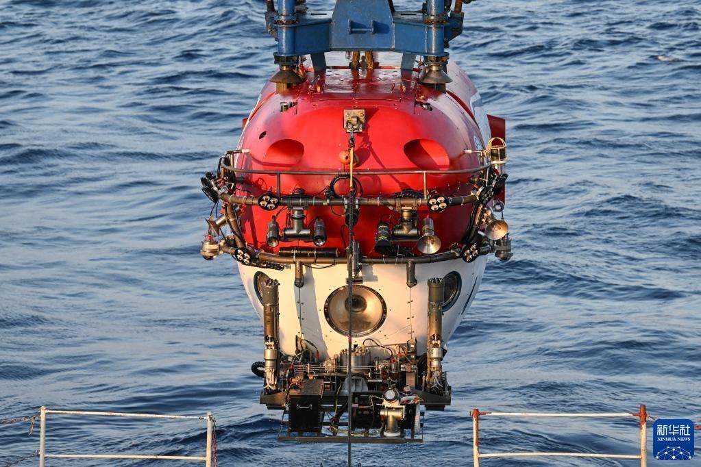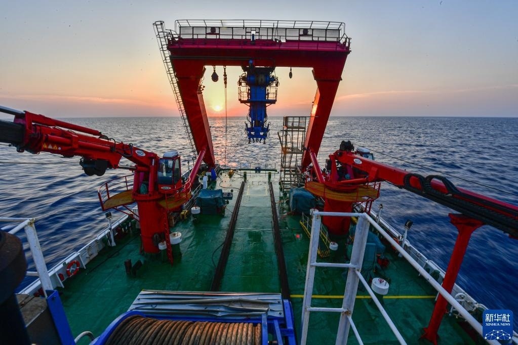 搭載著考古隊員的“深海勇士”號載人潛水器從“探索一號”科考船下放至海面,即將下潛開始當(dāng)日的水下調(diào)查(5月24日攝)。
