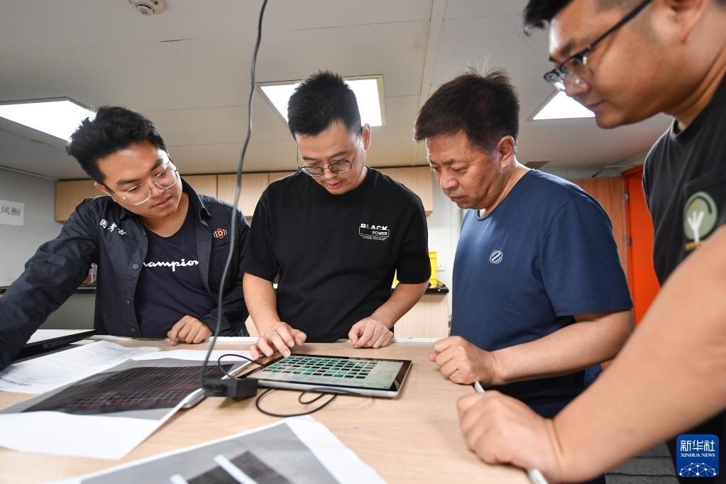 考古隊員在“探索一號”科考船上查看從水下采集的考古數(shù)據(jù)(5月24日攝)。