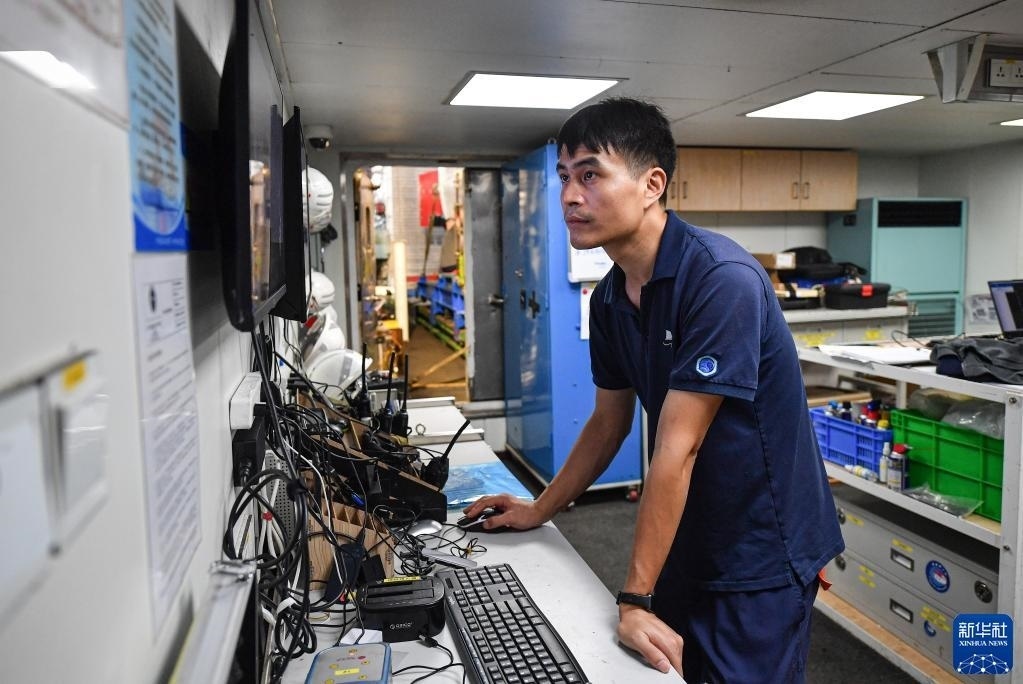 潛航員在“探索一號”科考船上整理從水下采集的考古數(shù)據(jù)(5月25日攝)。