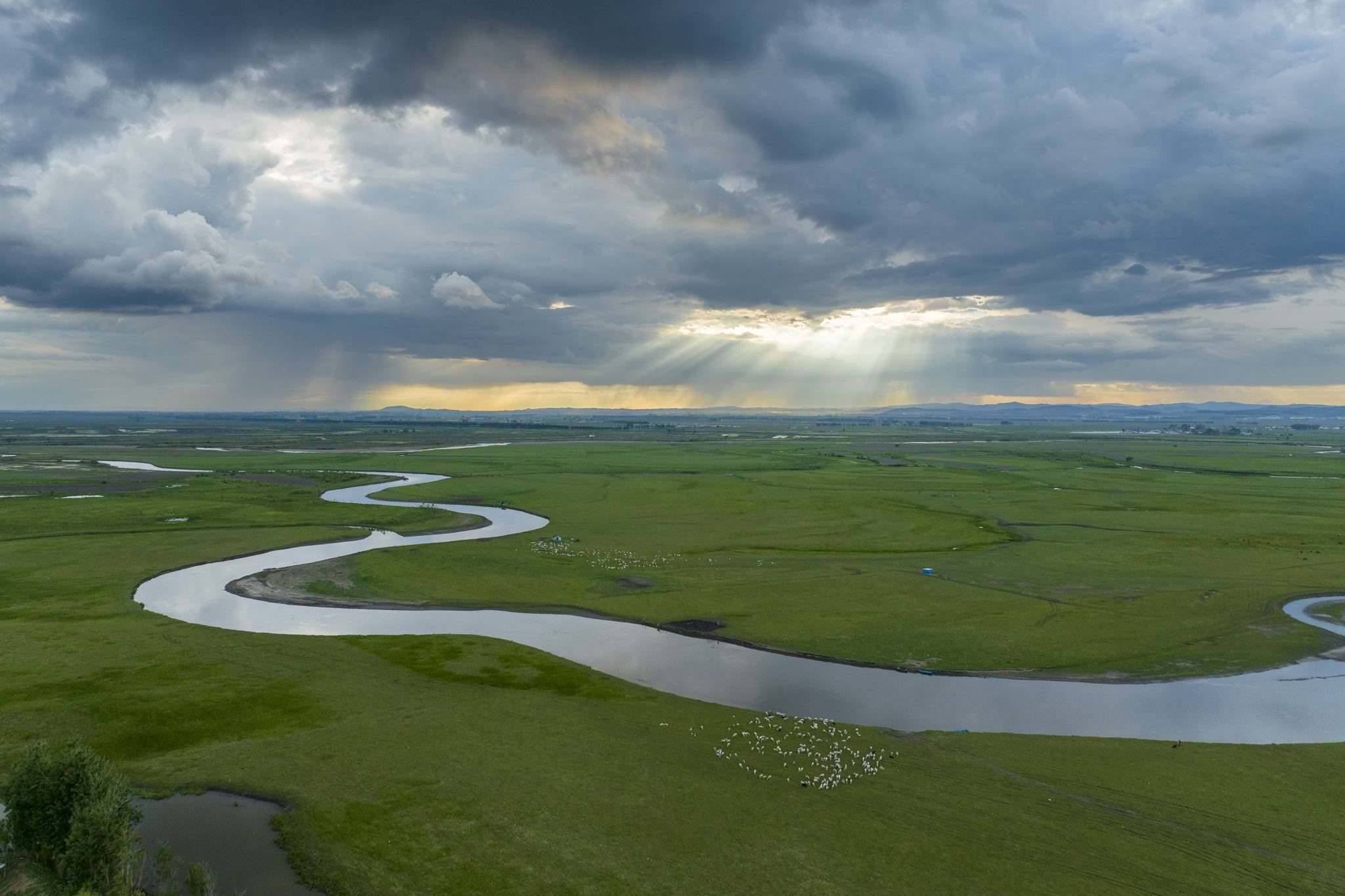2023年6月2日傍晚,黑龍江雞西,在密山境內(nèi)的穆棱河流域上空云景變幻,河套草原景色秀美。視覺(jué)中國(guó)
