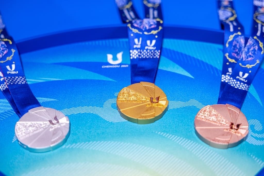 獎(jiǎng)牌是每個(gè)體育賽事的重要組成部分之一,本屆大運(yùn)會(huì)獎(jiǎng)牌根據(jù)國際大體聯(lián)要求,融合成都和國際化傳播元素,最終形成了大運(yùn)會(huì)獎(jiǎng)牌“蓉光”。獎(jiǎng)牌整體設(shè)計(jì)以成都大運(yùn)會(huì)會(huì)徽和太陽神鳥為主要靈感,利用幾何扇面代表太陽光芒,傳遞了太陽神鳥守護(hù)夢想的設(shè)計(jì)概念。獎(jiǎng)牌以“蓉光”為名,諧音為“榮光”,寓意榮耀、光彩,寄托了對大運(yùn)健兒在成都青春展翅、乘夢而行的美好期許。