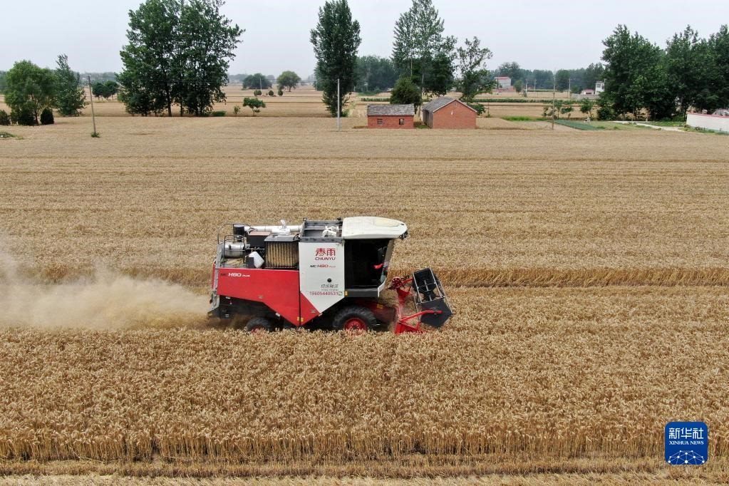 6月2日,在安徽省阜陽(yáng)市阜南縣許堂鄉(xiāng)劉崗村,董斐斐駕駛收割機(jī)為村民收割小麥(無(wú)人機(jī)照片)。