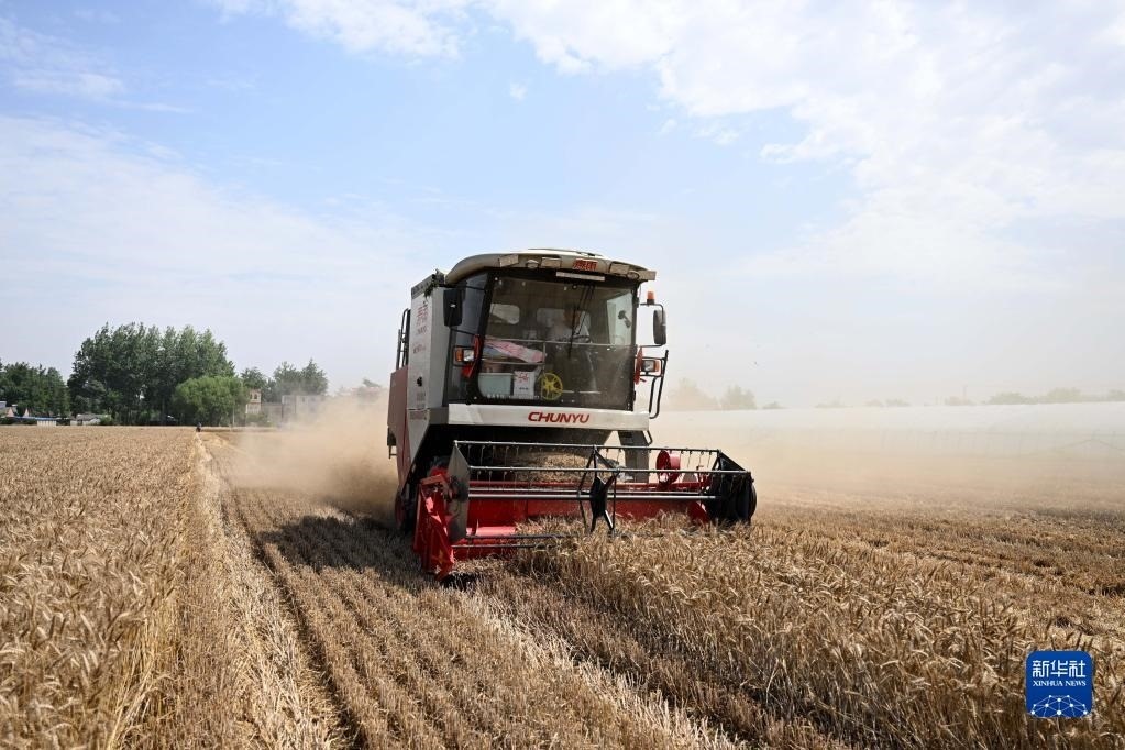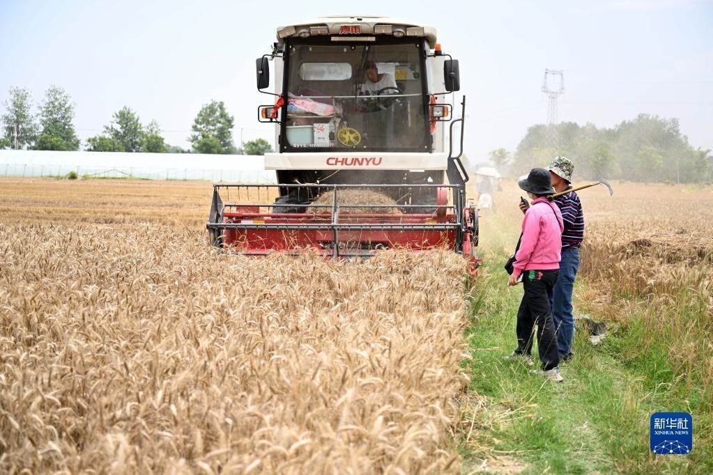 6月2日,在安徽省阜陽(yáng)市阜南縣許堂鄉(xiāng)劉崗村,董斐斐駕駛收割機(jī)為村民收割小麥。