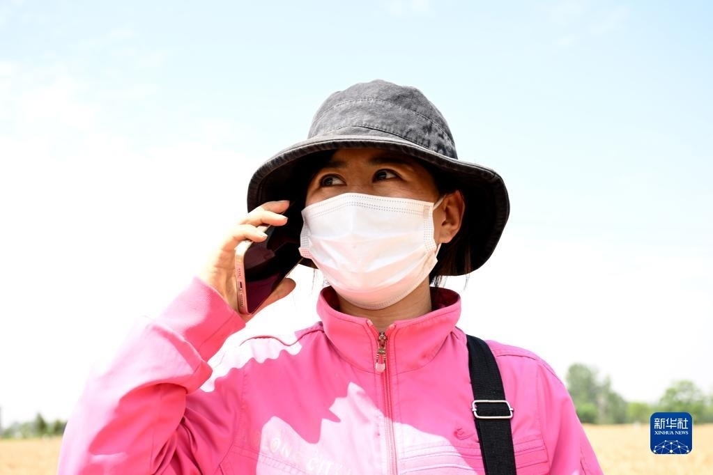 6月2日,在安徽省阜陽(yáng)市阜南縣許堂鄉(xiāng)劉崗村,陳麗娟和朋友電話聯(lián)系下一站的收割業(yè)務(wù)。