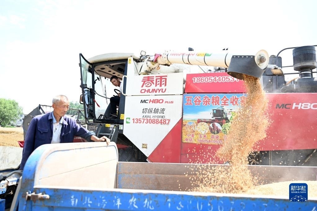 6月2日,在安徽省阜陽(yáng)市阜南縣許堂鄉(xiāng)劉崗村,董斐斐駕駛收割機(jī)將收割的小麥裝車。