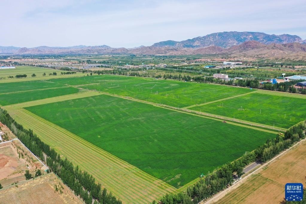這是6月4日拍攝的土默特左旗國家現(xiàn)代農(nóng)業(yè)示范區(qū)內(nèi)的苜蓿種植基地(無人機(jī)照片)。