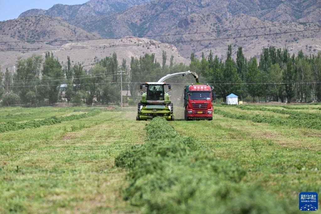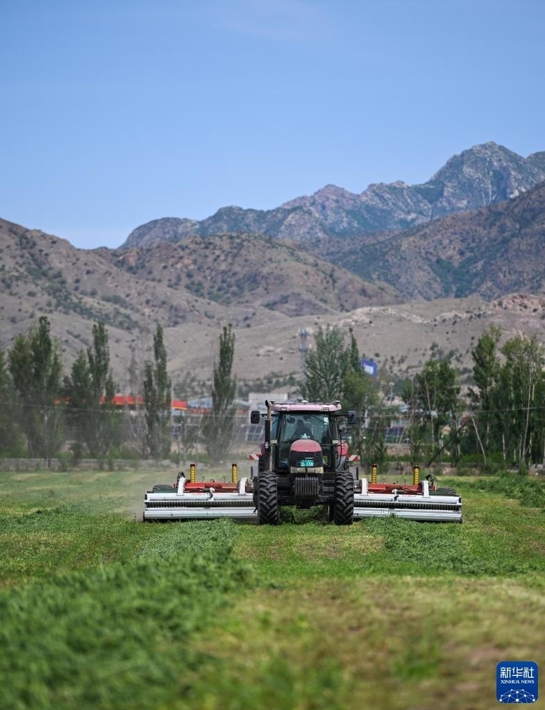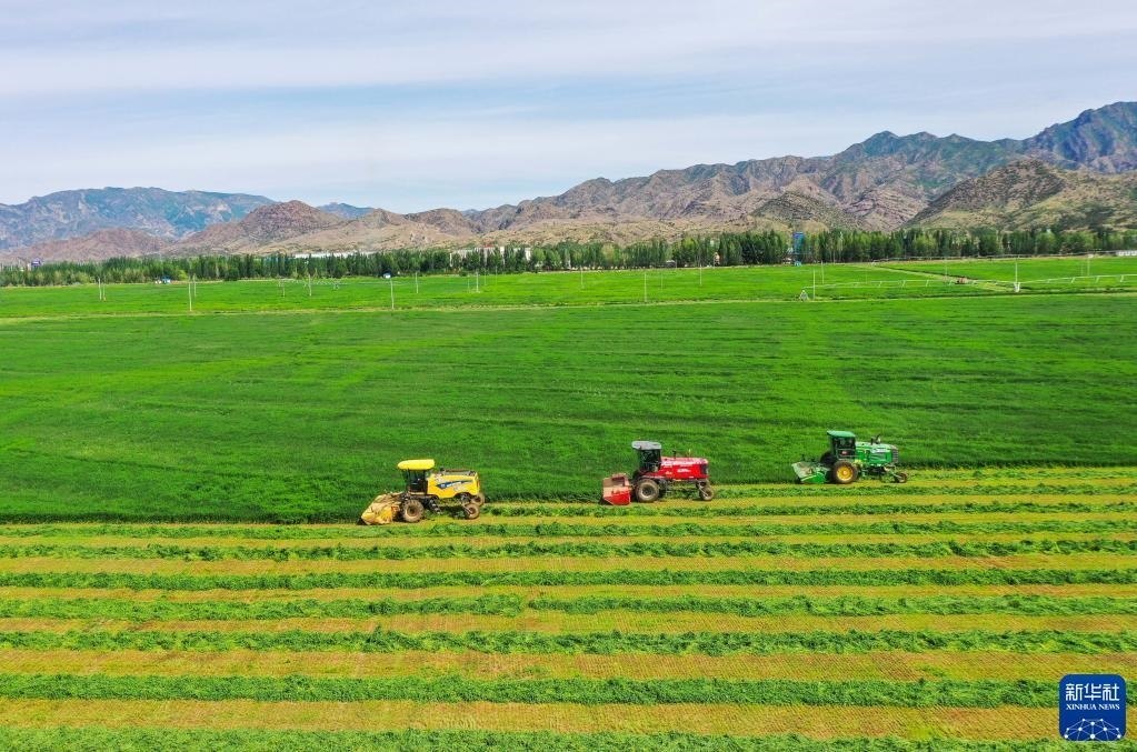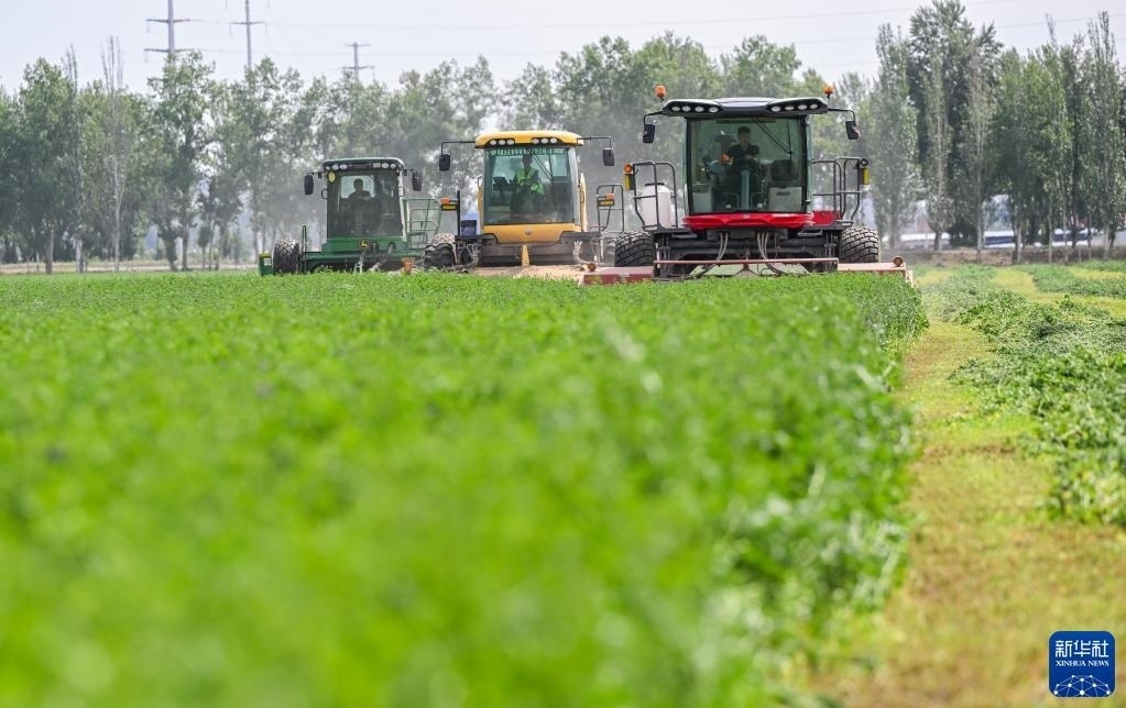 6月4日,在土默特左旗國家現(xiàn)代農(nóng)業(yè)示范區(qū)內(nèi),機(jī)械車輛在收割苜蓿。