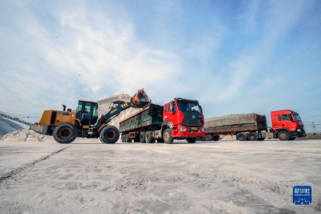 6月4日,工人操作設(shè)備在唐山海港經(jīng)濟開發(fā)區(qū)長蘆大清河鹽場將海鹽裝車,準(zhǔn)備外運。