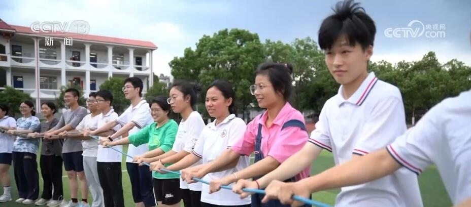 在四川廣漢中學(xué),一場專門針對(duì)高三學(xué)子的趣味接力賽正在開展。同學(xué)們?cè)谕瓿少惻?、跳繩等項(xiàng)目的同時(shí),需要團(tuán)隊(duì)協(xié)作完成顛網(wǎng)球、射門等項(xiàng)目。