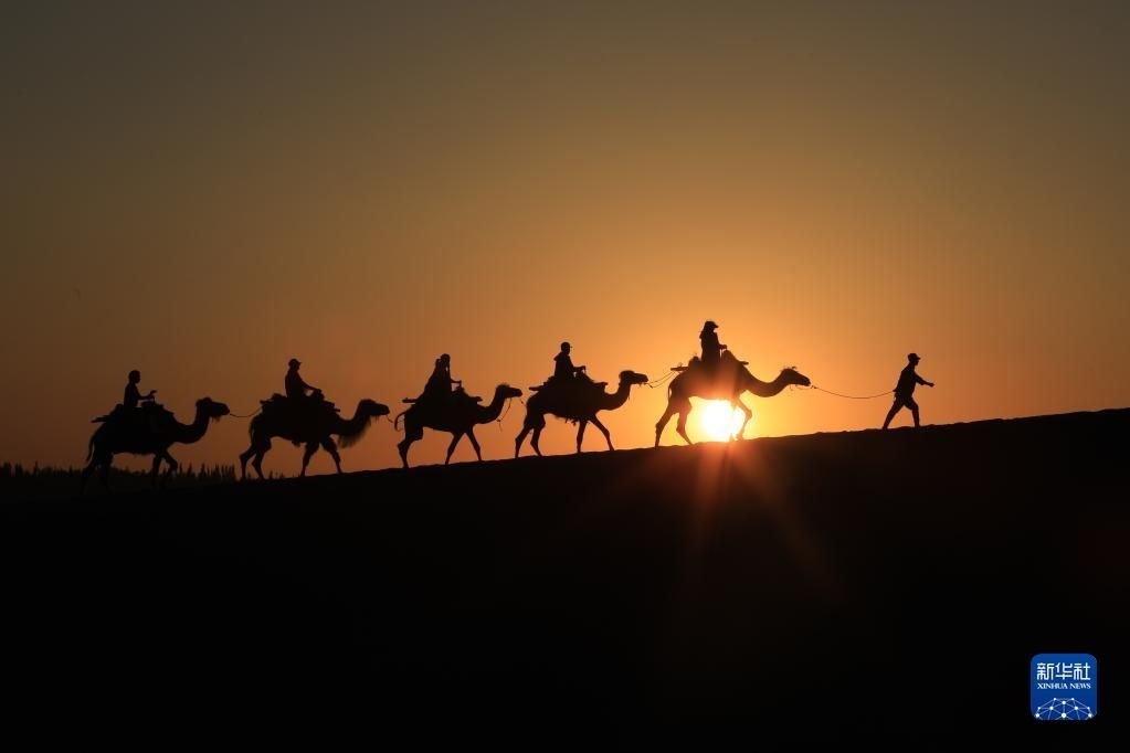 6月7日,在甘肅敦煌鳴沙山月牙泉景區(qū),游客騎乘駱駝感受大漠風(fēng)光。