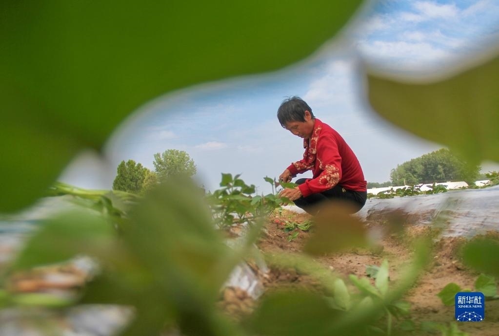 6月5日,村民在河南省商丘市夏邑縣會(huì)亭鎮(zhèn)西街北村田間補(bǔ)栽紅薯苗。