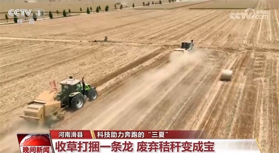 在河南滑縣上官鎮(zhèn)的麥田里,多種農(nóng)機(jī)正在聯(lián)合作業(yè)。在收割機(jī)后面緊跟著的是摟草機(jī)和秸稈打捆機(jī),摟草機(jī)將散落的秸稈摟成行,打捆機(jī)緊跟著吸附秸稈、收草打捆。運(yùn)輸車輛將碼好的秸稈拉往養(yǎng)殖場(chǎng)、發(fā)電廠進(jìn)行綜合利用。