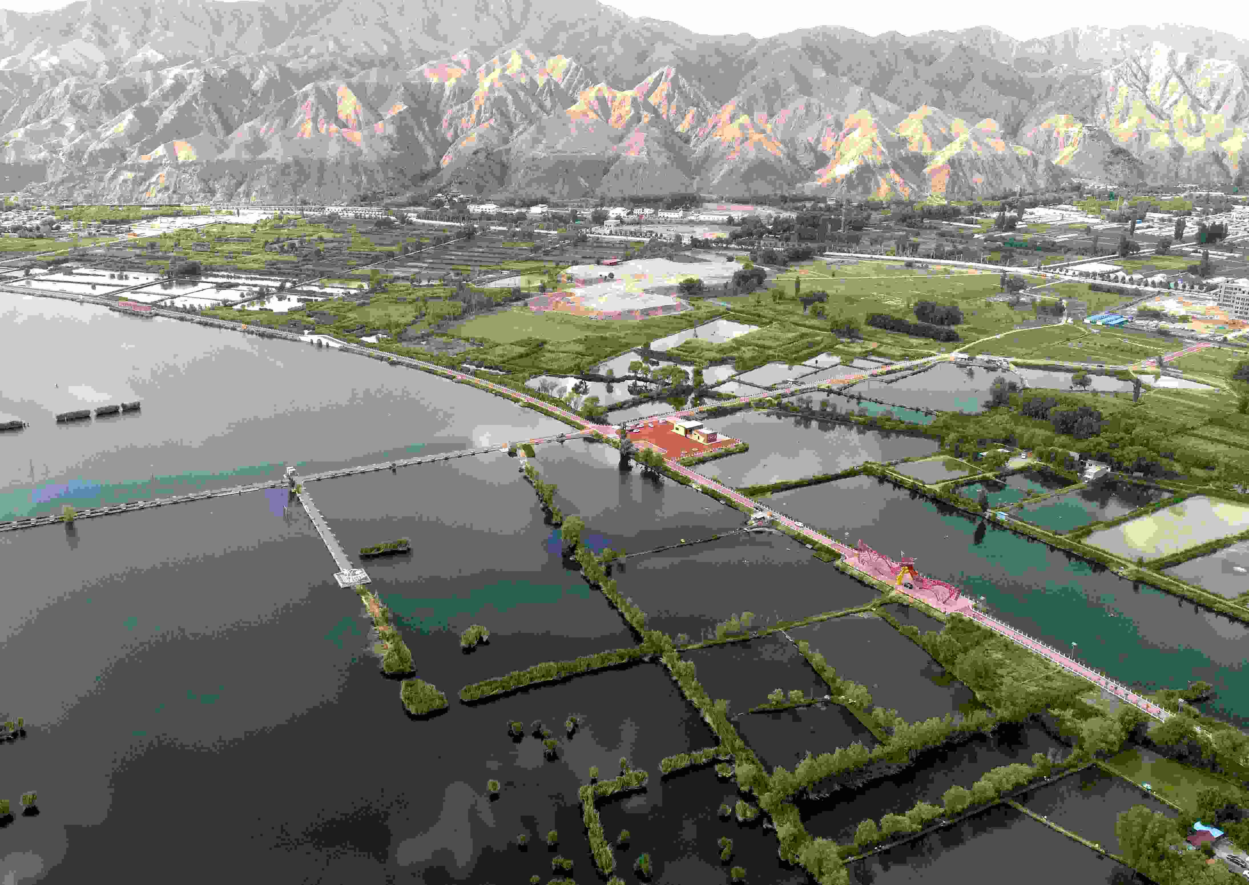 初夏時(shí)節(jié),甘肅省永靖縣太極島黃河濕地風(fēng)光秀麗,島上蘆草叢生,綠意盎然,游客乘船在蘆葦蕩里游玩。沿河公路與狹長(zhǎng)的黃河交相輝映,星羅棋布的人工魚塘宛如一塊塊玉石鑲嵌在大地上,勾勒出一幅美妙的山水田園畫卷。近年來(lái),永靖縣依托太極島黃河濕地豐富的生態(tài)資源,將文旅產(chǎn)業(yè)與生態(tài)保護(hù)相結(jié)合,進(jìn)一步提升水產(chǎn)養(yǎng)殖、濕地保護(hù)以及休閑旅游功能。