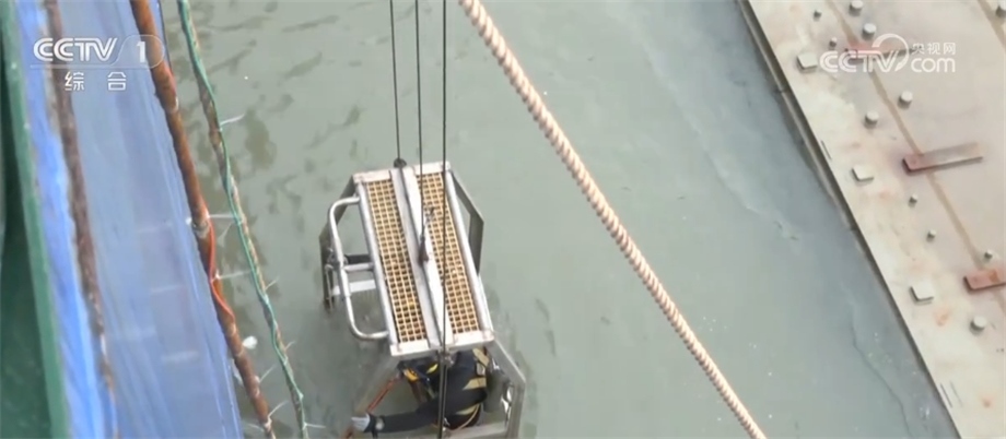 6月9日凌晨5時左右,準備潛水檢查作業(yè)的4名潛水員分別從船頭船尾下水,檢查即將安裝的最后一個管節(jié)兩端是否存在異物,并在水下安裝最終接頭測控設備。