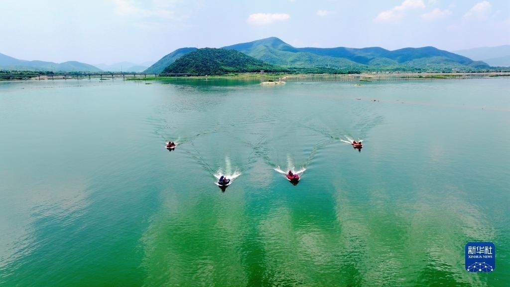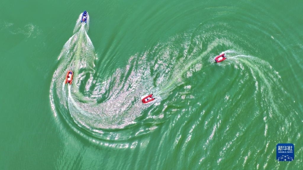 當(dāng)日,在浙江省湖州市長興縣合溪水庫煤山段,煤山鎮(zhèn)組織黨員干部、應(yīng)急管理隊員、志愿者組成應(yīng)急救援隊,開展防汛減災(zāi)應(yīng)急綜合實戰(zhàn)演練,通過沖鋒舟編隊、水上打撈、水上救援等課目訓(xùn)練,增強防汛應(yīng)急處置和水上搶險救災(zāi)能力。新華社發(fā)(許旭 攝)