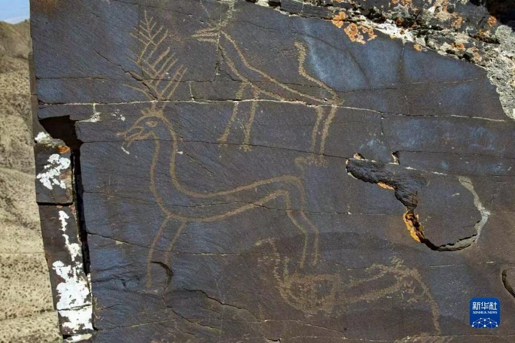 甘肅省酒泉市肅北蒙古族自治縣旱峽巖畫(huà)中的一幅鹿形、狼形巖畫(huà)(資料照片)。