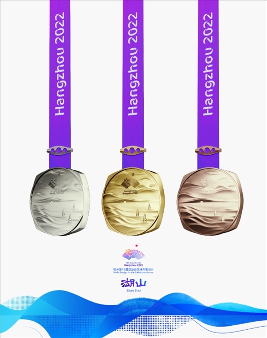 獎(jiǎng)牌取名為“湖山”,它的設(shè)計(jì)靈感源自五千年良渚文明,展示中國江南文化,呈現(xiàn)杭州山水景觀。在亞運(yùn)會(huì)獎(jiǎng)牌設(shè)計(jì)中首次將方形玉琮和圓形獎(jiǎng)?wù)氯跒橐惑w,其中獎(jiǎng)牌正面用凸出的線條勾勒出“三面云山一面城”的杭城畫卷,湖水漣漪,山巒起伏;獎(jiǎng)牌背面,形似方形印章,寓意運(yùn)動(dòng)員們在杭州亞運(yùn)會(huì)上留下美好的印記。
